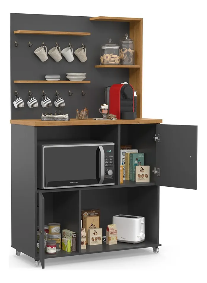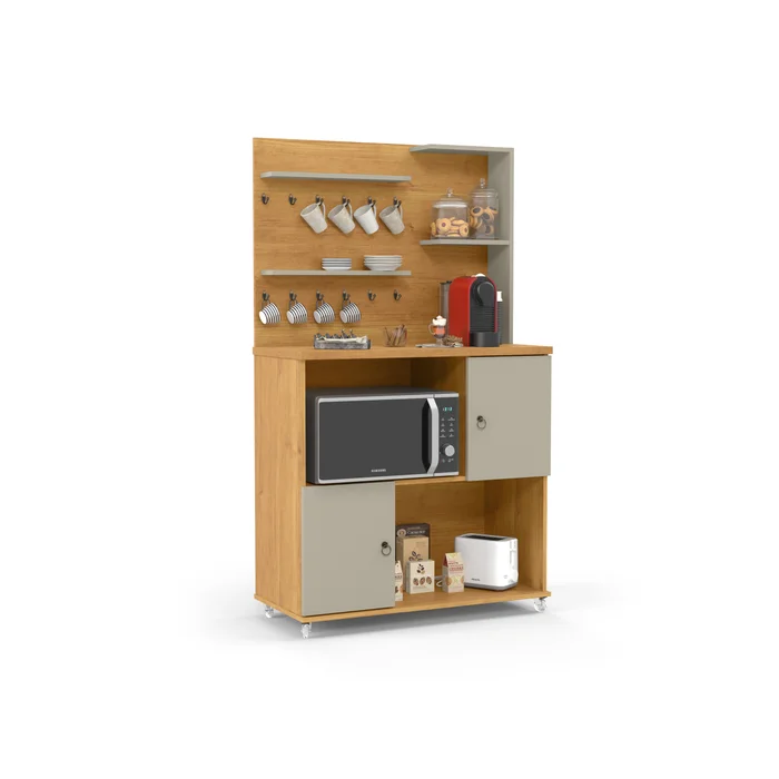 Além disso, o Cantinho do Café Aconchego conta com um nicho especialmente projetado para acomodar seu micro-ondas. Essa funcionalidade permite que você aqueça suas bebidas com praticidade, proporcionando ainda mais comodidade ao seu espaço.
