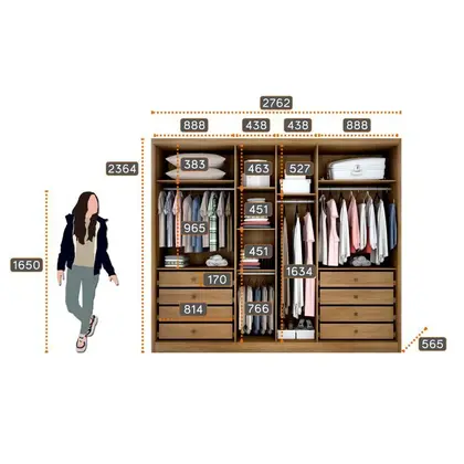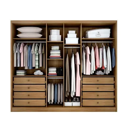 | Componentes do Móvel | Puxadores com acabamento amadeirado, colunado em 25mm, interno ele e ela, espaço para longo, gavetas internas com puxadores, dobradiças de pressão de 35mm, corrediças telescópicas, cabideiros e calceiros em alumínio |