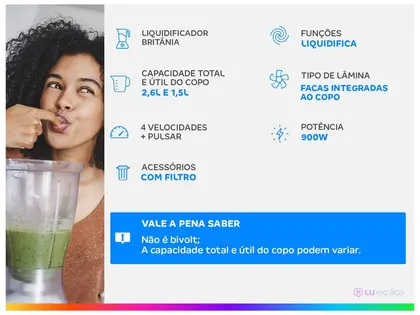 O Liquidificador Britânia Diamante 800 – 1050W – 4 Velocidades – Função Ice e Pulsar – Preto – 110V oferece potência e eficiência para quem busca desempenho superior na cozinha. Com 1050W, ele tritura gelo com facilidade, bate misturas densas e prepara sucos, vitaminas e molhos com textura perfeita. Suas 4 velocidades, aliadas à Função Pulsar, garantem controle total do preparo, permitindo ajustar a intensidade conforme a necessidade. As lâminas resistentes proporcionam trituração rápida e homogênea, enquanto a jarra espaçosa torna o uso mais prático no dia a dia. Com design moderno em preto e alta durabilidade, o Diamante 800 é a escolha ideal para quem deseja potência, qualidade e versatilidade em um único aparelho.
