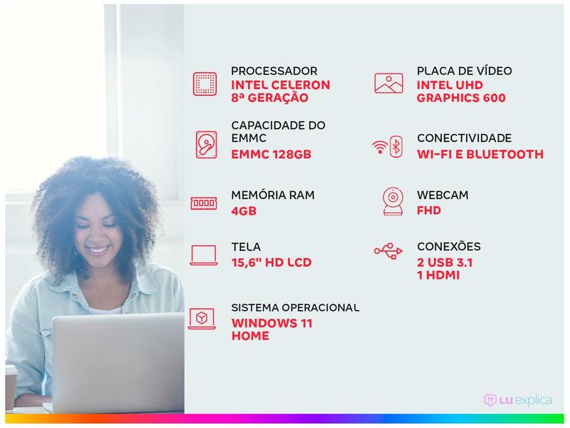 Para quem busca tecnologia, acessibilidade e mobilidade, tudo em um único notebook. O notebook Ultra UB261, além de possuir sistema operacional Windows 11 Home, conta com 4GB de Memória RAM e 128GB de armazenamento eMMC, entregando uma velocidade maior na utilização diária e armazenamento para suprir a necessidade de quem precisa de espaço para suas fotos, vídeos e arquivos no dia a dia. Possui tela LCD de 15,6″ com resolução HD (1366×768). Com processador Intel Celeron N4020C de 8ª geração, é ideal para quem quer tecnologia e potência aliadas à mobilidade. Em parceria com a Microsoft, este modelo acompanha uma assinatura de 1 ano do Microsoft 365 Personal. Além disso, você tem acesso a 1TB de armazenamento na Nuvem via OneDrive, para aumentar ainda mais a capacidade e guardar todas as suas fotos, vídeos, músicas e arquivos e acessá-los de qualquer lugar em qualquer momento. Com design elegante, ainda conta com teclas de atalho.