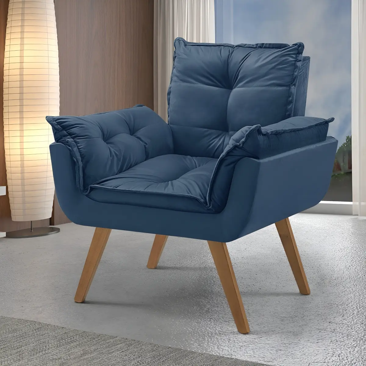 Poltrona em Veludo Base Palito Quadrada Opalla Prime POLTRONA OPALLA PRIME EM VELUDO – CONFORTO, CHARME E ELEGÂNCIA EM UM SÓ MÓVEL A Poltrona Opalla Prime é a escolha ideal para quem busca unir conforto absoluto com um visual moderno e sofisticado. Com estofamento em veludo de toque macio e base palito quadrada, ela é perfeita para compor qualquer ambiente com personalidade – da sala de estar ao home office. Suas cores vibrantes são um verdadeiro destaque, transformando a decoração e trazendo vida ao espaço. Confeccionada com materiais de alta qualidade, a Opalla proporciona o equilíbrio ideal entre beleza e funcionalidade, com dimensões planejadas para garantir o máximo bem-estar. Diferenciais que encantam: Design elegante com acabamento em veludo, toque suave e sofisticado; Base palito quadrada, moderna e resistente; Cores vivas e marcantes, que valorizam qualquer decoração; Medidas confortáveis, perfeitas para relaxar com estilo. Estilo : Moderno Peso (kg) : 15 Altura (cm) : 85 Estampado : Não Extensível : Não Largura (cm) : 80 Possui Pés : 4 Acompanha Puff : Não Possui Rodízio : Não Suporta Até (kg) : 120 Design Assinado : Não Profundidade (cm) : 70 Tipo de Assento : Fixo Tipo de Encosto : Fixo Material dos Pés : Madeira Maciça Tipo de Poltrona : Decorativa Altura do Encosto : 37 Material do Braço : Madeira Origem do Produto : Nacional Ambiente Principal : Sala de Estar Firmeza do Assento : Médio Modelo de Poltrona : Fixo Almofada do Assento : Fixa Almofada do Encosto : Fixa Enchimento do Braço : Fibra Siliconada Tecido Predominante : Veludo Enchimento do Assento : Espuma D-23 Enchimento do Encosto : Fibra Siliconada Encosto para a Cabeça : Não Possui Apoio para Braços : Sim Tipo de Espuma do Assento : Espuma Convencional Acompanha Almofadas Extras : Não Possui Percintas Elásticas : Sim Altura do Assento até o Chão : 48 Cor : Azul Itens Inclusos : 1 Poltrona Cor Predominante : Azul Linha ou Coleção : Opalla